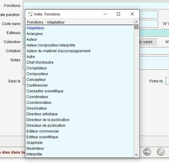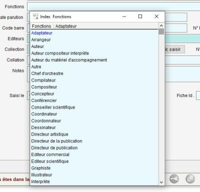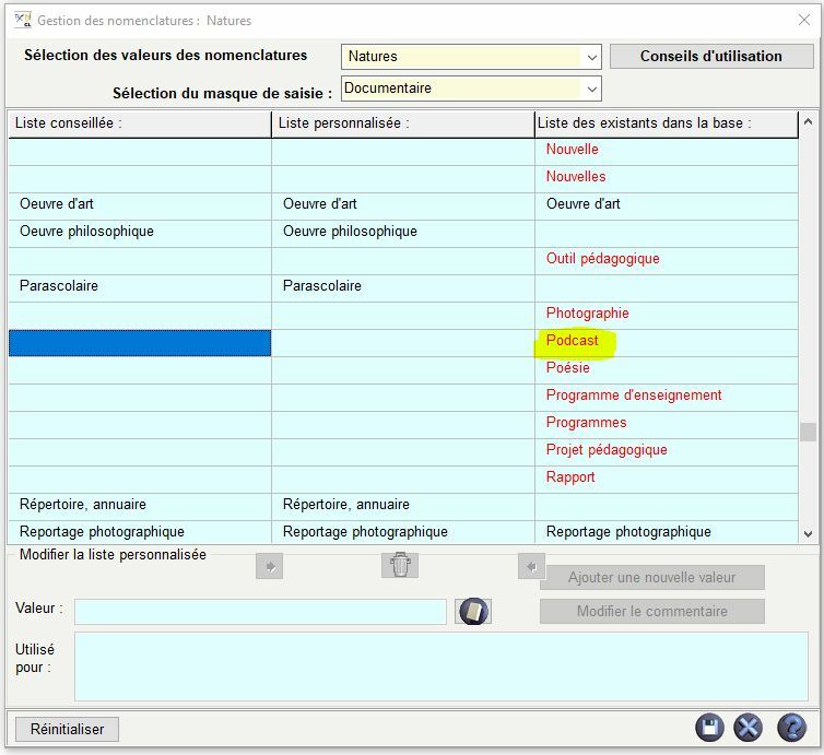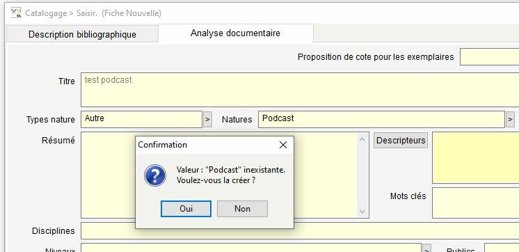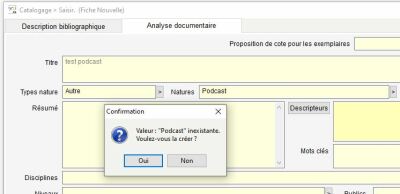 Lorsque l'on va créer la première notice avec la nature podcast, on verra cet item dans la liste personnalisée (accès avec les flèches) mais on ne le verra pas dans la liste des existants (double-clic) car aucune notice ne contient cet item.