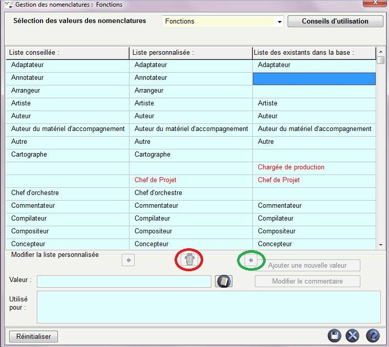 Les listes qui figurent ici sont seulement les index. Pour modifier les notices, il faut passer par le module Harmonisation de la base > Mettre en cohérence > Nomenclatures.